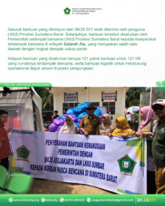 Dalam tahap penyaluran, BK3S DIY menjalin sinergi dengan Lembaga Koordinasi Kesejahteraan Sosial (LKKS) Sumatera Barat sebagai mitra di daerah terdampak. Kolaborasi ini menjadi bagian penting dalam memastikan bahwa bantuan yang telah dihimpun dapat disalurkan secara tepat sasaran, efektif, dan sesuai dengan kebutuhan riil di lapangan. Peran LKKS Sumatera Barat sebagai representasi kelembagaan di tingkat daerah memungkinkan proses distribusi berjalan lebih terarah, mengingat kedekatan mereka dengan kondisi sosial dan dinamika lokal masyarakat setempat.